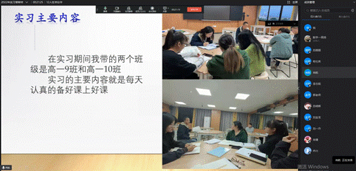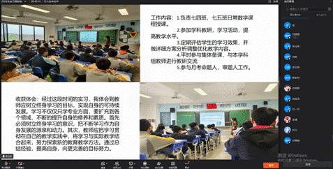答辩员工通过共享PPT,介绍实习单位、实习时间、实习工作内容完成等基本情况。每个同学都分享了实习收获体会,并进行了教学片段展示。与会教师针对员工的汇报,提出问题,并查阅实习材料。最终学院评选出刘一丹等8名同学为优秀实习生。