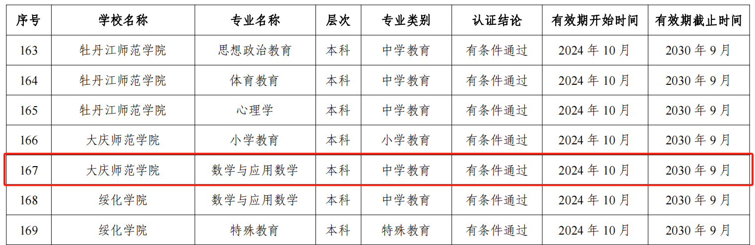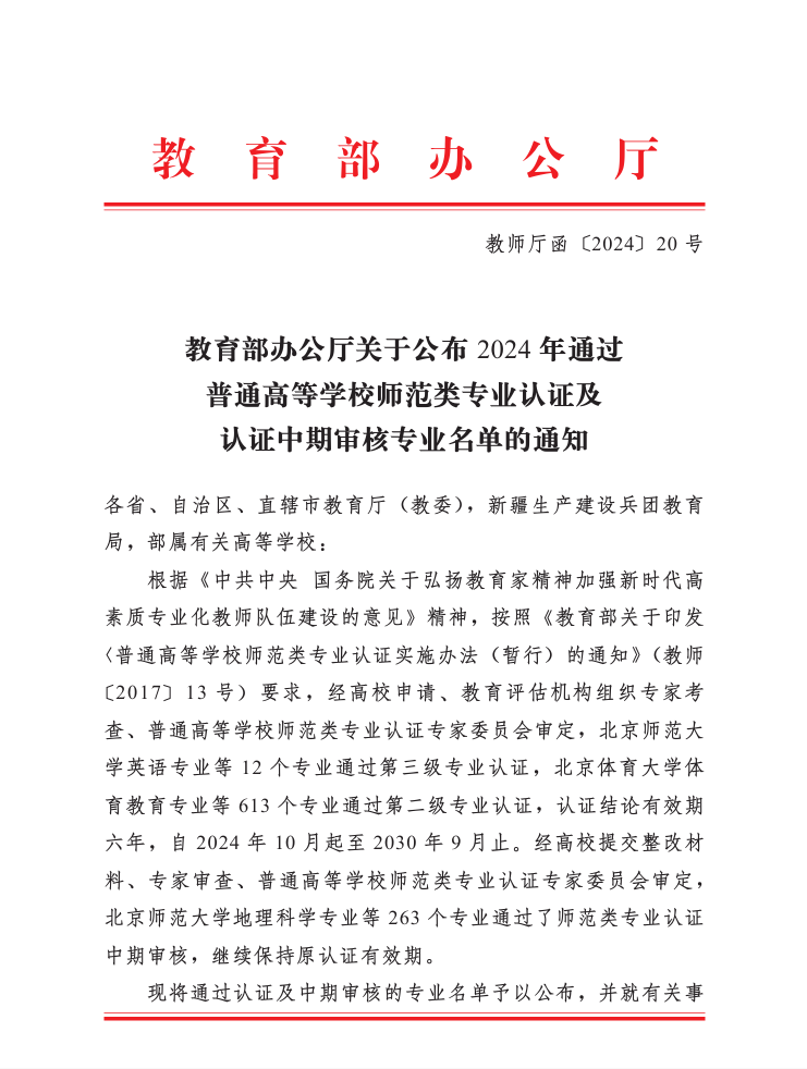 近日,教育部办公厅发布《关于公布2024年通过普通高等学校师范类专业认证及认证中期审核专业名单的通知》(教师厅函〔2024〕20号),公司数学与应用数学专业通过教育部师范类专业第二级认证,认证结论有效期为2024年10月至2030年9月。