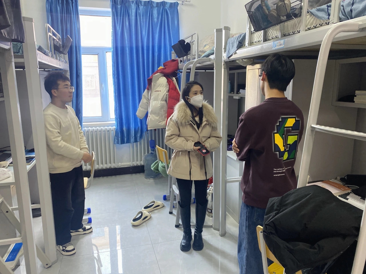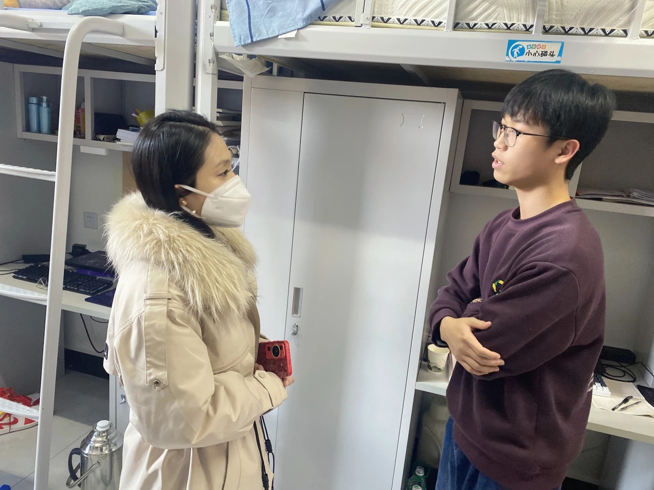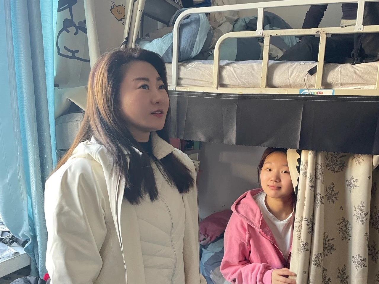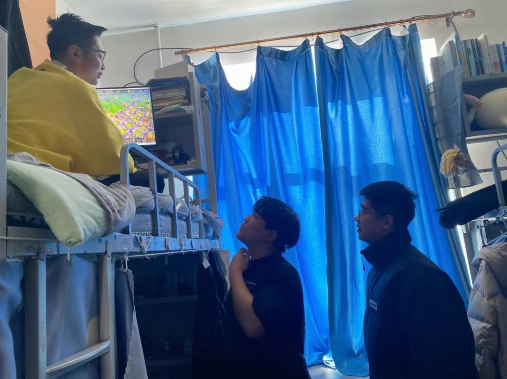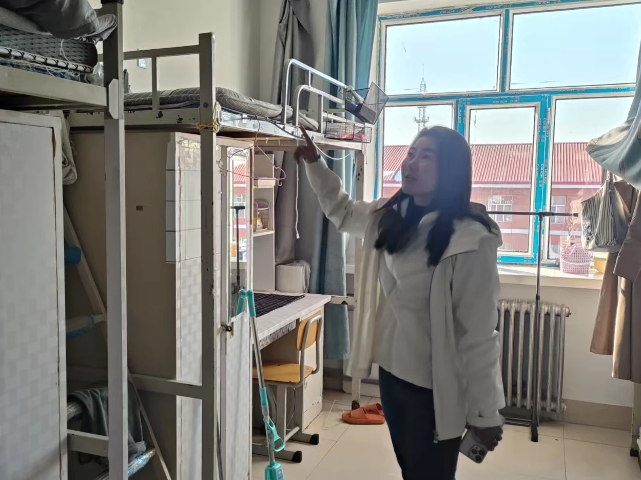 老师细心查看每一间宿舍的卫生状况,鼓励同学们养成良好个人卫生习惯。提醒同学们注意用电安全也是此次走访的重点之一,确保为同学们营造安全的居住环境。