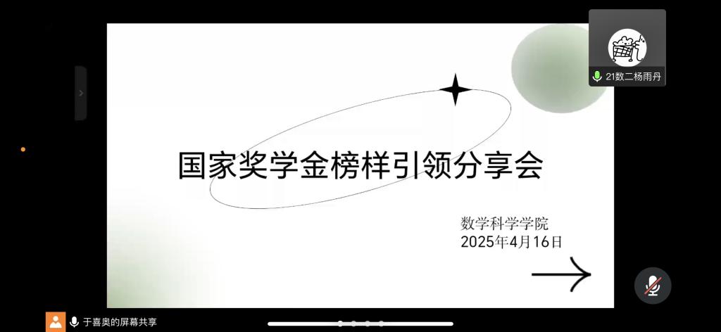 为充分发挥榜样力量,激发广大学子的奋进之心,传承优秀经验,助力更多同学逐梦前行,best365中国官方网站召开线上国家奖学金榜样引领分享会,邀请国家奖学金获得者杨雨丹分享学习经验与成长心路历程。杨雨丹作为best365中国官方网站 2021级数学与应用数学专业佼佼者,荣获多项荣誉,连续两年专业成绩、连续三年综合测评成绩均列专业第一,还立志毕业后投身基层教育事业,用所学知识为孩子们的成长贡献力量。