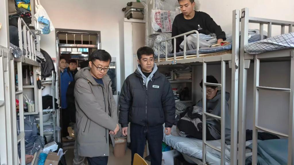 走访过程中,他们与同学们亲切交流,首先详细询问冬季生活需求,叮嘱大家近期气温骤降,务必做好防寒保暖措施,及时增添衣物,同时保持规律作息与健康饮食习惯,以良好身心状态投入学习生活。随后,围绕寝室安全防护提出要求,提醒同学们离开寝室时务必随手锁门,妥善保管个人贵重物品,增强安全防范意识。重点强调宿舍用电安全规范,明确禁止使用大功率电器,告诫同学们避免插线板超负荷运行,杜绝安全隐患。最后,叮嘱大家注重寝室环境卫生,及时清理生活垃圾,共同营造整洁舒适的居住环境,助力大家养成良好学习生活习惯。同学们纷纷表示,感谢学院的悉心关怀与温暖问候,未来将把这份关怀转化为学习奋进的动力,不负学院期望。