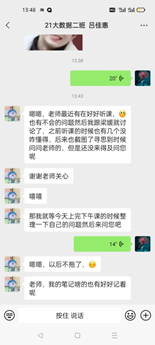 沙老师利用微信班级的同学逐个沟通,有的员工都会有惰性,有的不善于在人前表达。需要老师的及时引导,问他们有没有哪些内容是不会的?学习状态什么样?他们看到老师逐个沟通,老师认真了,他们也就重视了起来,现在课后时间问问题的员工也特别多了,有的员工深夜还在学习,沙老师就及时给他们点赞;哪些员工问问题积极,就在朋友圈中发圈表扬,得到鼓励和肯定他们就越学越有劲!
