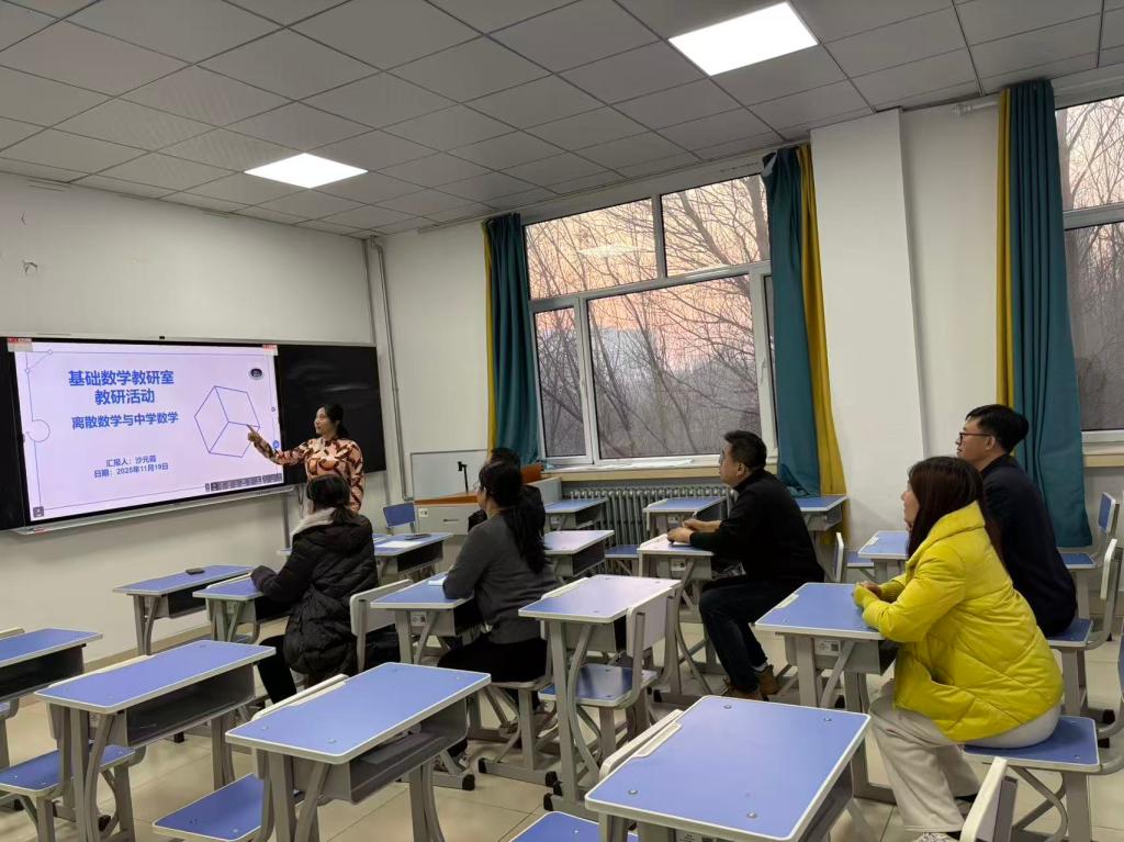 2025年11月19日,基础数学教研室“离散数学与中学数学”主题开展教研活动,副经理沙元霞担任主讲。