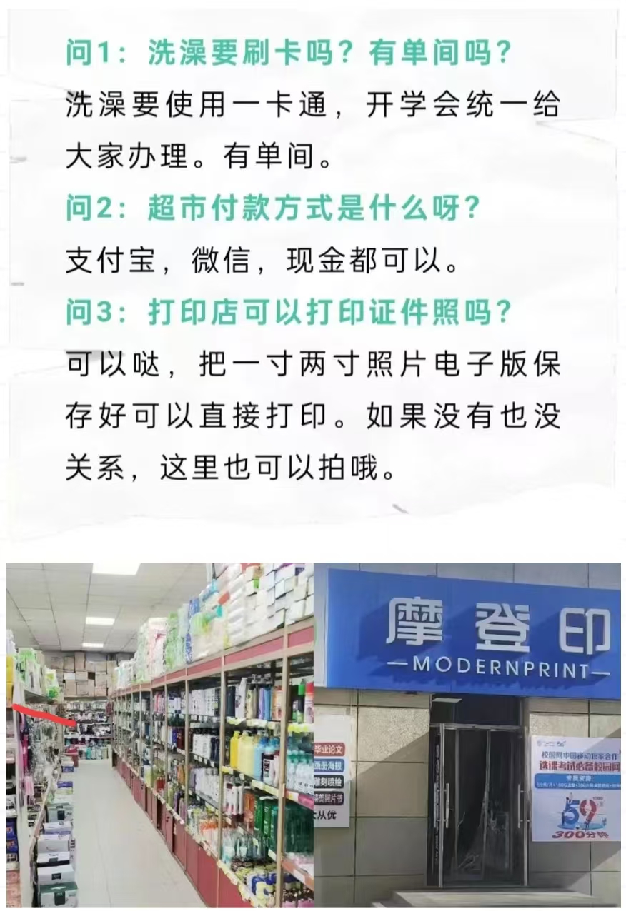 这三种设施都在一个长廊,超市贩卖的物品也是很全滴,日常用品、食品、学习用品应有尽有。正对着的就是我们的洗浴中心,洗浴前方就是我们的打印店。出了长廊还有一家打印店就是我们的摩登印啦。大家可以根据需要去选择打印店铺哦!