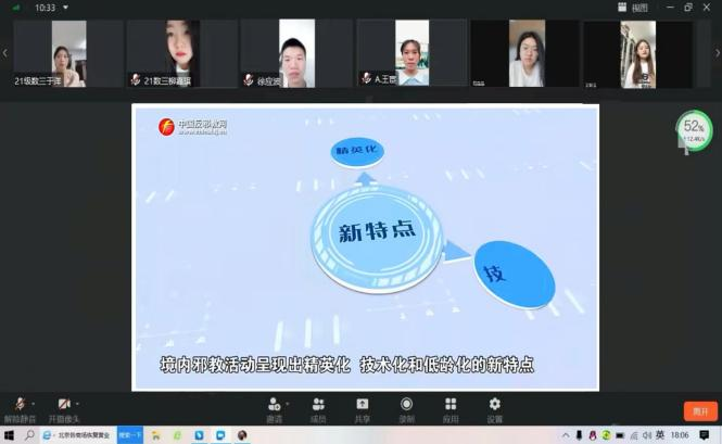 此次班会由各班团支书组织本班同学线上观看《警惕邪教对大学校园的侵袭》,让同学们了解到什么是邪教,邪教的性质、特征、危害性,以及遇到邪教应该如何处理。告诫同学们对邪教言论做到不听、不看,鼓励同学们积极检举揭发邪教的违法犯罪活动。同时引导员工们认清邪教的危害,做到自觉抵制邪教,积极参加反邪教活动。
