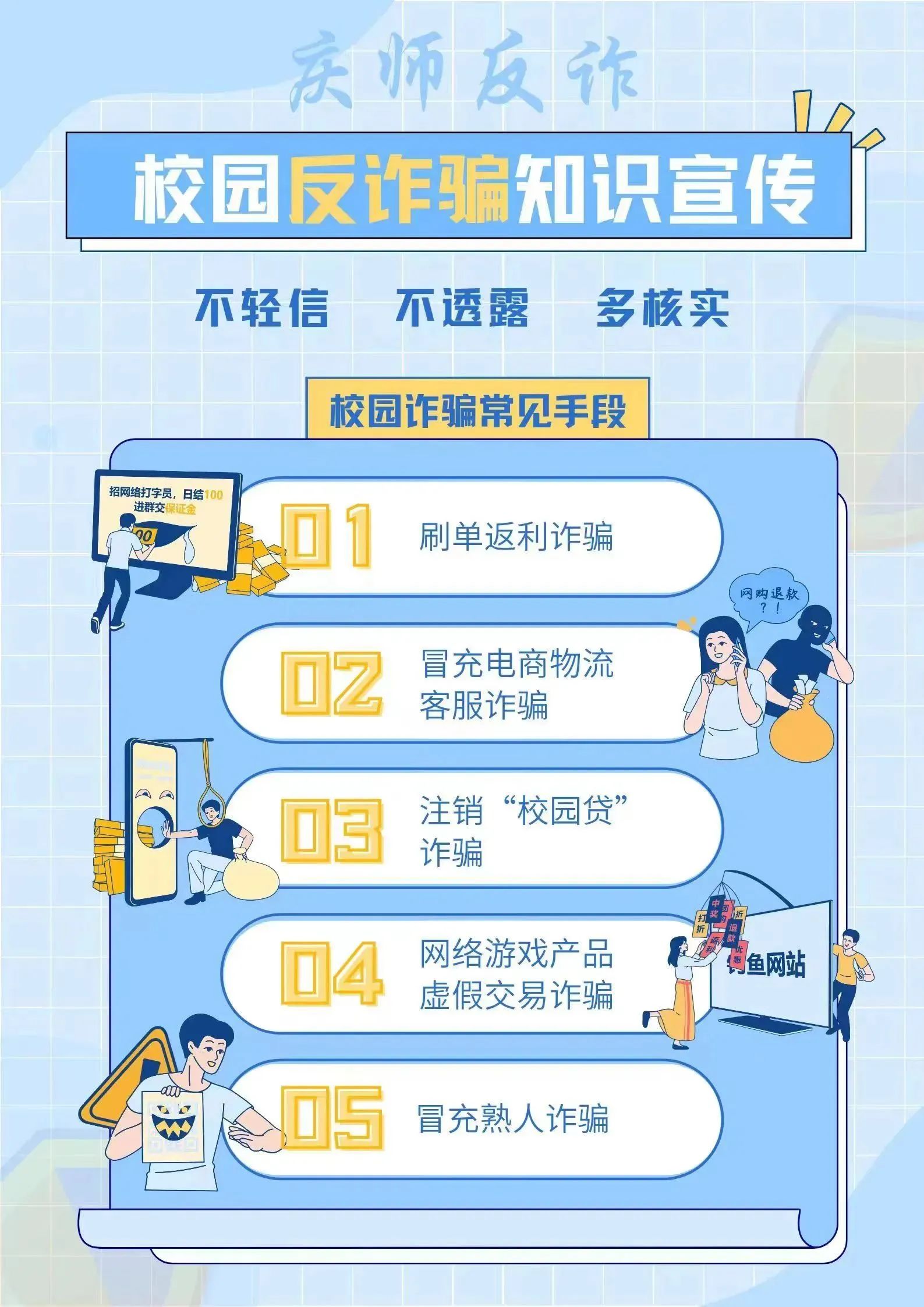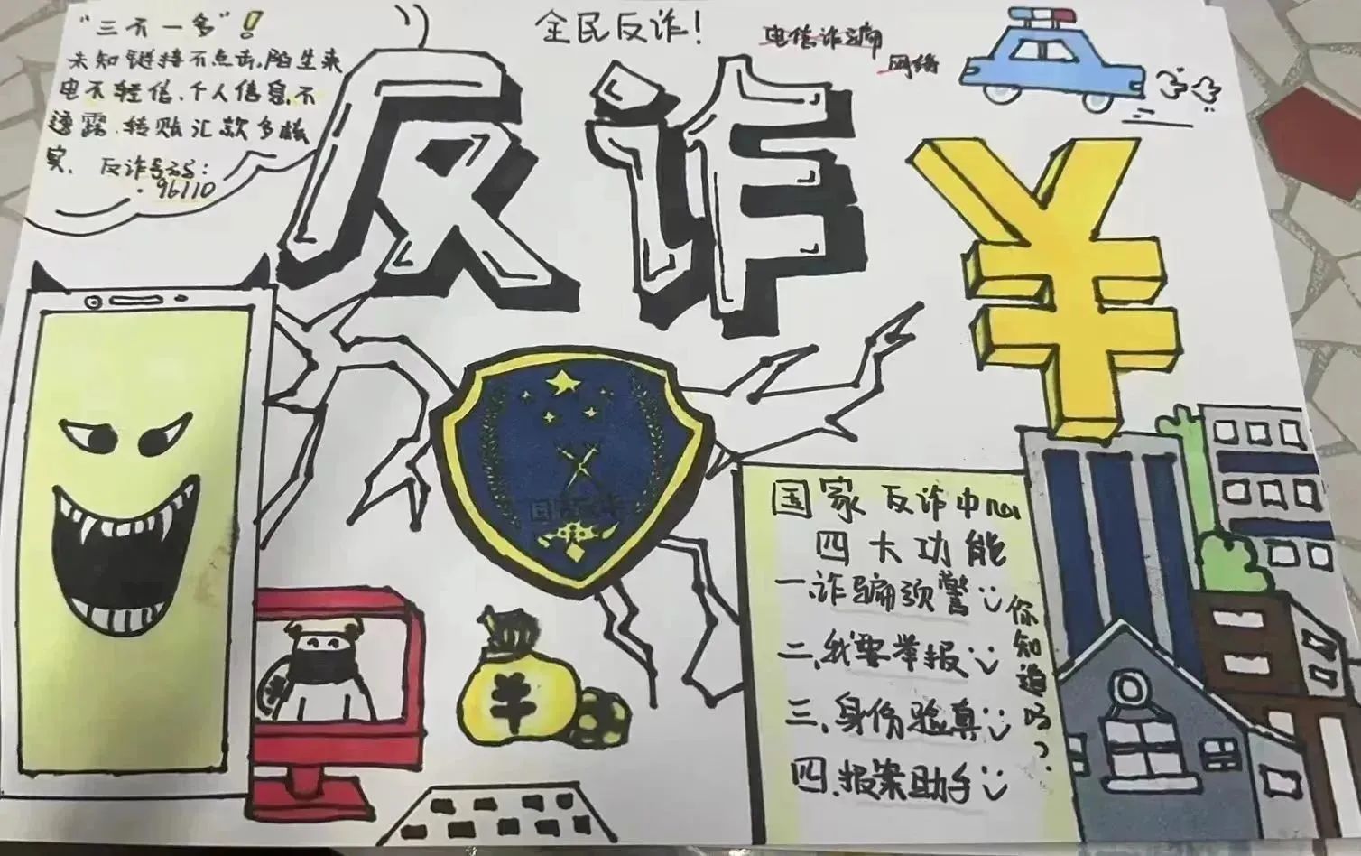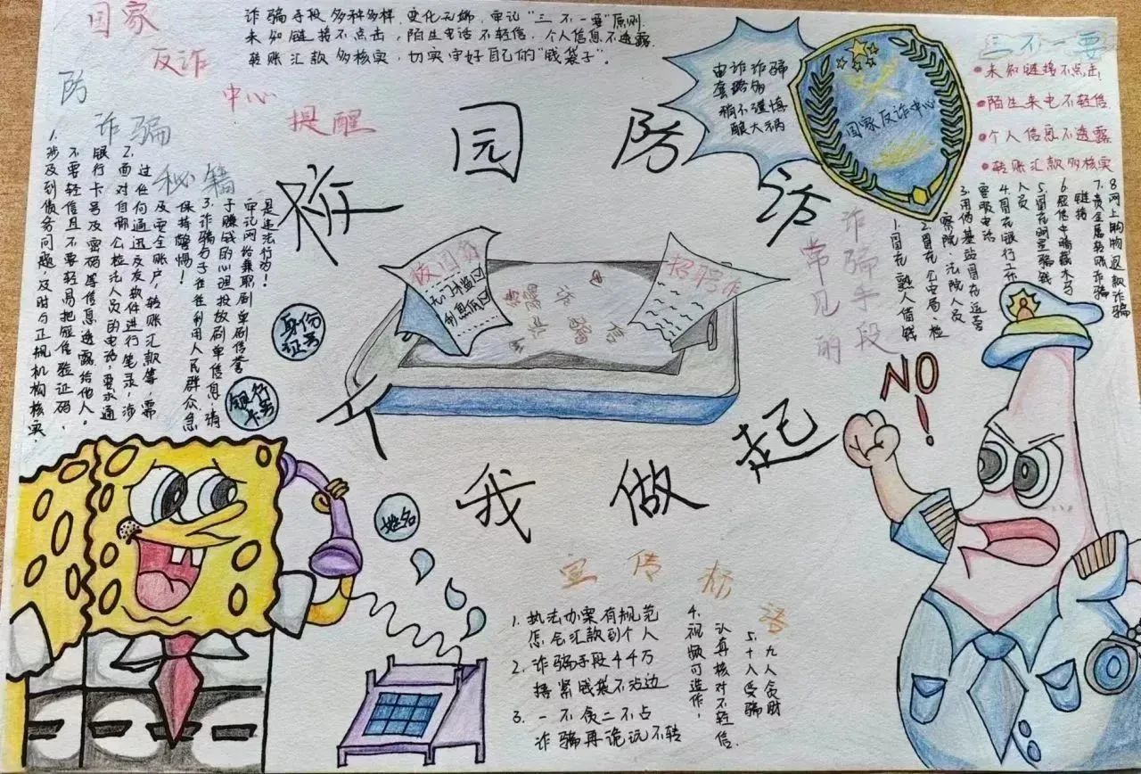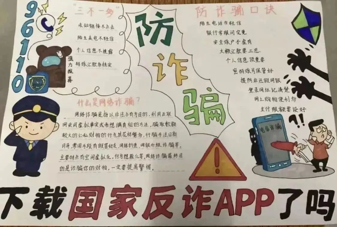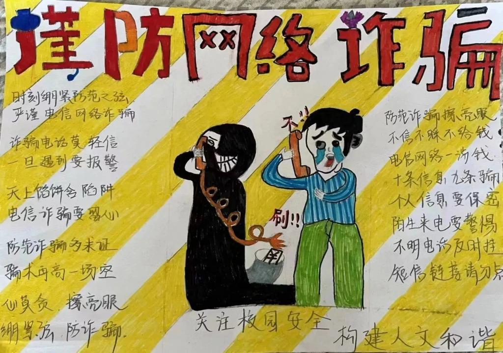 同学们用反诈标语、反诈口诀等文字内容,充分发挥创新能力,从版面、内容、寓意等方面着手,创作出一幅幅富有创意的作品,引导同学们增强诈骗防范意识、有效防范诈骗风险。