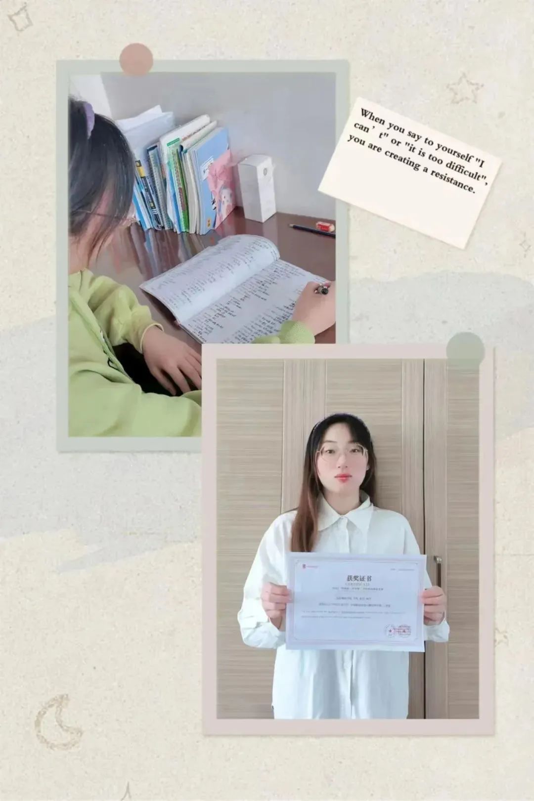 2022年我的关键词是“充实”,回望这一年,丰富的经历在时间轴上跳跃。在这一年里,我学到了很多的专业知识,在电视机前激动地看着冬奥比赛,成为“刘耕宏”女孩,我还申请成为社区志愿者帮助大家统计信息、进行扫码,虽然很累但却很快乐并收获了许多!由于口罩原因没回学校参加四级考试,但我也每天坚持按计划背单词,令我印象最深刻的一件事就是参加了2022“外研社·国才杯”全国英语阅读大赛并取得了三等奖。放弃很容易,但坚持下来一定很酷!我要继续努力,争取下次拿到一等奖。大家也要一直坚持做自己喜欢的事情,要不断充实好自己的老员工活,不忘初心,努力成为自己渴望成为的那个人。“往者不可谏,来者犹可追”,希望新的一年自己能够更加努力,不负韶华,向前冲吧!2022再见啦!!!