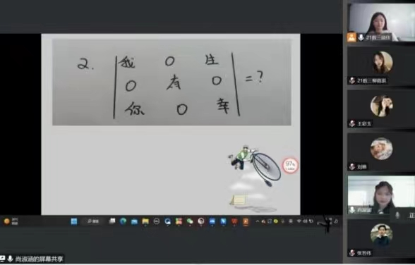 随后使21级数学三班尚淑涵同学,通过趣味的做题方法,让大家更清晰的了解高等代数中行列式的应用,展现了浪漫的数学解法。通过她的讲解,同学们很快的掌握,并积极回应。