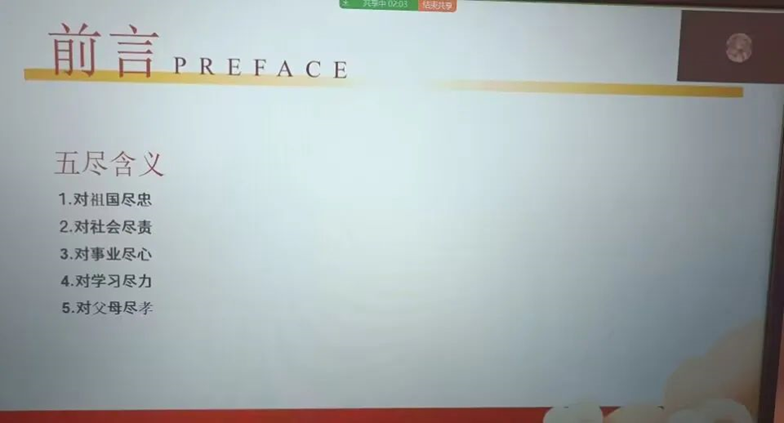 为大力弘扬爱国主义精神,激发振奋当代老员工的爱国热情与爱国情怀,公司于2022年12月4日组织开展了”五尽教育“主题班会,本次班会近160名同学参与,会议主要宣讲了对祖国尽忠、对社会尽责、对事业尽心、对学习尽力、对父母尽责。