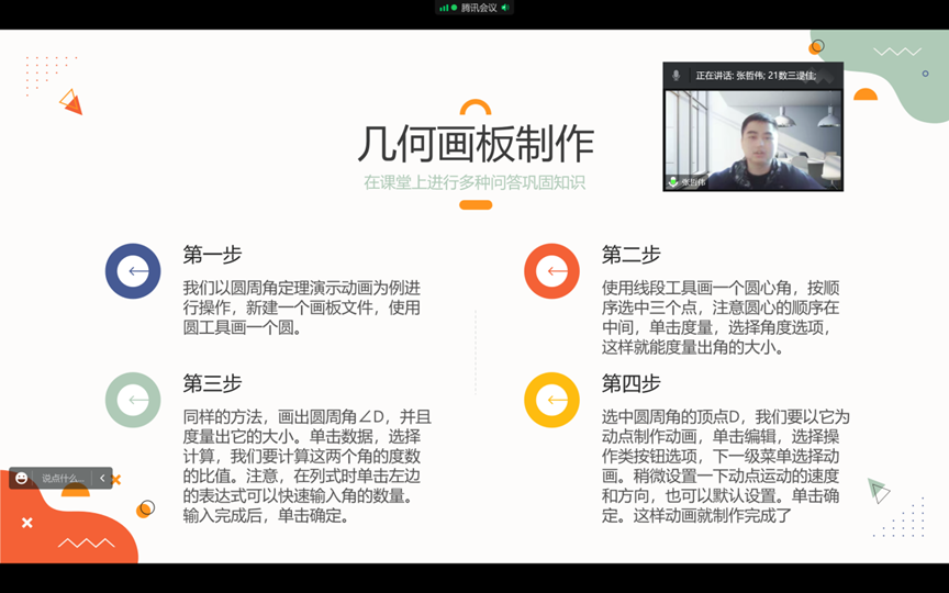 优势一:动态性,可以用鼠标拖动图形上任一元素(点、线、圆),而事先给定的所有几何关系(即图形的基本性质)都保持不变,这样更有利于在图形的变化中把握不变,突破了传统教学的难点;