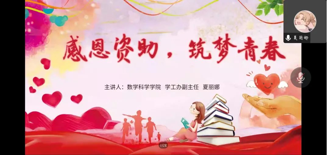 数学科学院学工办副主任夏丽娜老师于9月18日13:30于腾讯会议开展了“感恩资助,筑梦青春”资助教育主题活动。会上通过线上视频分享和PPT展示的方式,夏老师首先针对老员工国家资助政策进行了解读,主要分为奖、助、贷、勤、补、免六个方面。然后对贫困生认定的相关文件进一步讲解,关于国家助学金,国家奖学金,国家励志奖学金的评定流程,评定细则进行详细的解说。最后鼓励同学们积极参加勤工助学岗位的报名,培养员工们独立自主,自力更生的能力,对于国家对老员工教育的资助,要心存感恩,同时要树立诚信观念,激励同学们奋发图强,用实际行动回报社会。让资助诚信教育渗透到同学们的价值观念和处事准则中,化为资助工作的育人成效。