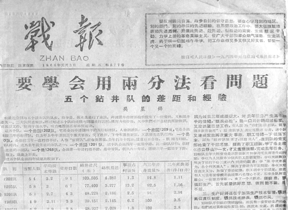 会战工委带头对照解放军和先进部门,找出18条差距,印发油田职工讨论。油田上下开展了“从高标准着眼,从大量的、常见的低标准、老毛病入手”的大找差距活动。两个月中,全油田从人到物、从工作到思想作风、从施工质量到执行规章制度,找出了120万个问题。在此基础上,油田上下全面认真整改,收到了显著成效,从而形成了一套用“两分法”总结工作的制度和做法。