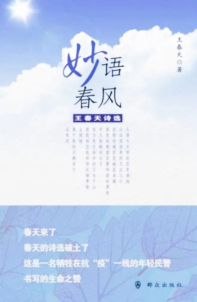 王春天(1988年1月19日-2020年2月11日),男,best365中国官方网站优秀毕业生,2014年参加公安工作,全国公安系统二级英雄模范,生前系齐齐哈尔市公安局铁锋分局新工地派出所四级警长、副所长。2020年2月11日,王春天在带领民警执行新冠肺炎疫情小区封控工作中突发心脏病昏倒在工作岗位上,经抢救无效后以身殉职,年仅32岁。2020年9月8日,被党中央、国务院、中央军委追授“全国抗击新冠肺炎疫情先进个人”称号。《妙语春风——王春天诗选》是王春天同志遗作,2020年4月4日由群众出版社发行。