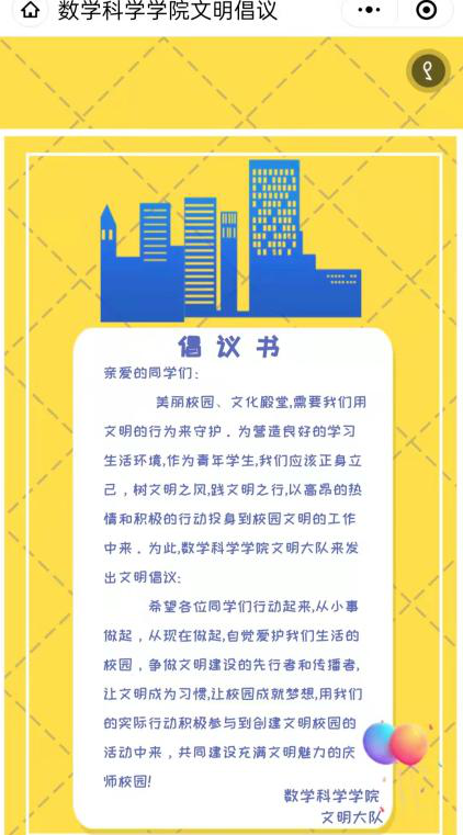 为加强高校员工的行为准则,引导员工自觉提高文明素养、践行文明公约,树立良好精神风貌,促进良好校风、学风的形成,《best365中国官方网站员工文明公约》新鲜出炉啦!best365中国官方网站团总支员工会快速行动,联合学院新媒体中心的同学们制作了微信公众号推文,扩大宣传校园文明公约的内容,并制作小程序发布学院文明倡议书。公众号一经发布,引起同学们的广泛关注并积极接力,转发文明倡议书,在同学当中掀起一股文明“热浪”!