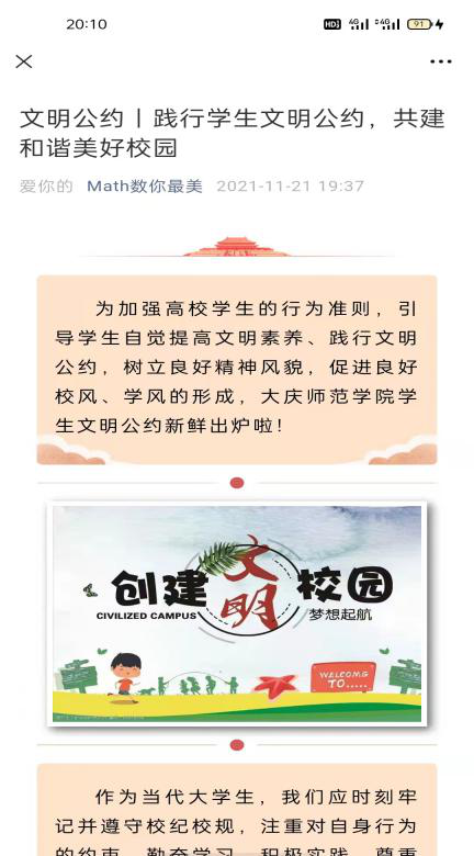 活动后,同学们纷纷表示认识到了文明的重要性,作为一名庆师人要践行好文明公约,争做文明老员工,努力让文明成为生活中的习惯,共建优美和谐校园。