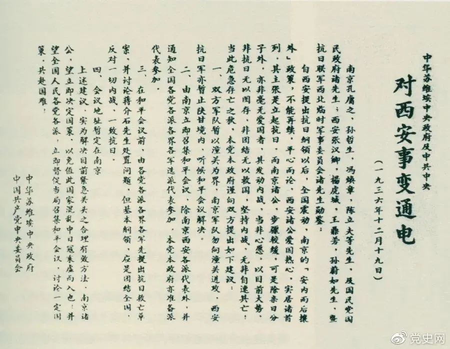 1936年12月19日,中华苏维埃中央政府和中共中央发表主张和平解决西安事变的《通电》。