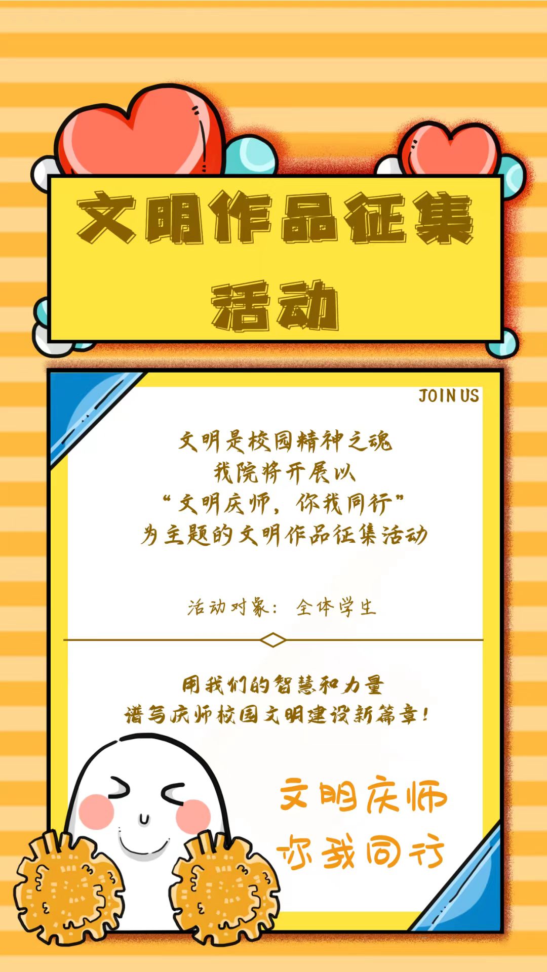 文明是校园精神之魂,为持续推进文明校园常态化建设,培育和践行社会主义核心价值观,继承和弘扬文明礼仪的中华传统美德,提升全体员工的文明素质,全面营造优美和谐的校园氛围,打造积极向上、拼搏进取的校园环境。公司将开展以“文明庆师,你我同行”为主题的文明作品征集活动。