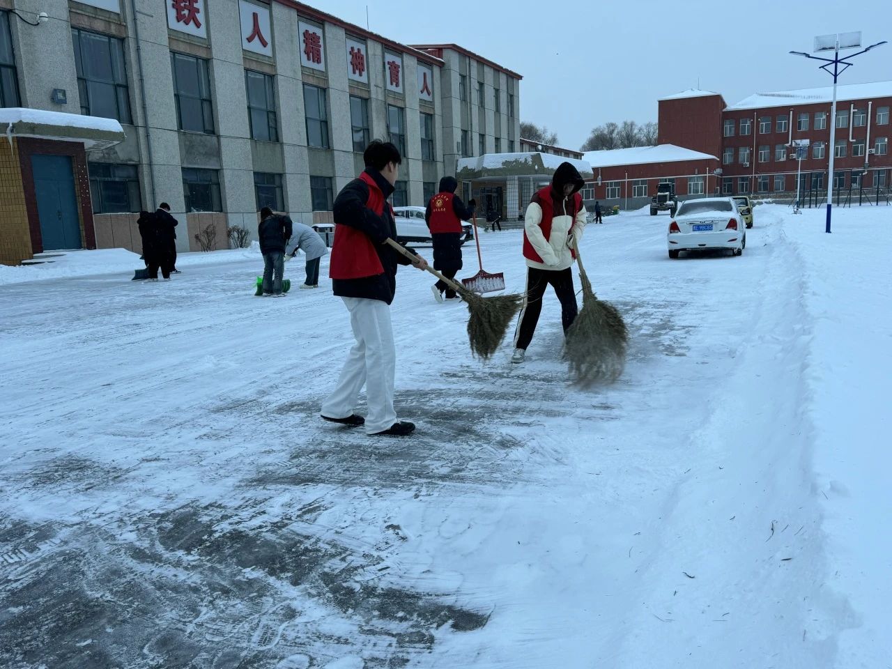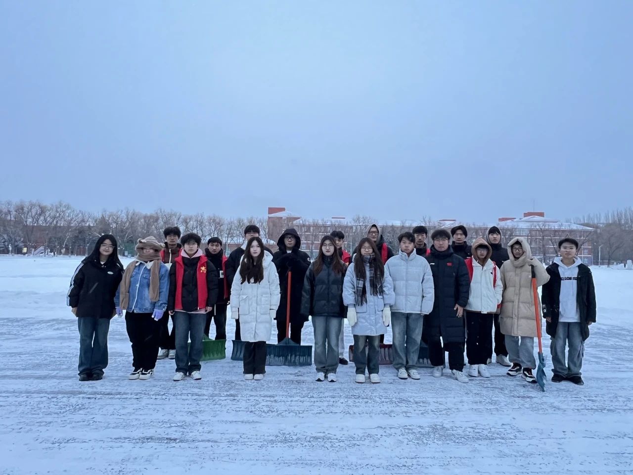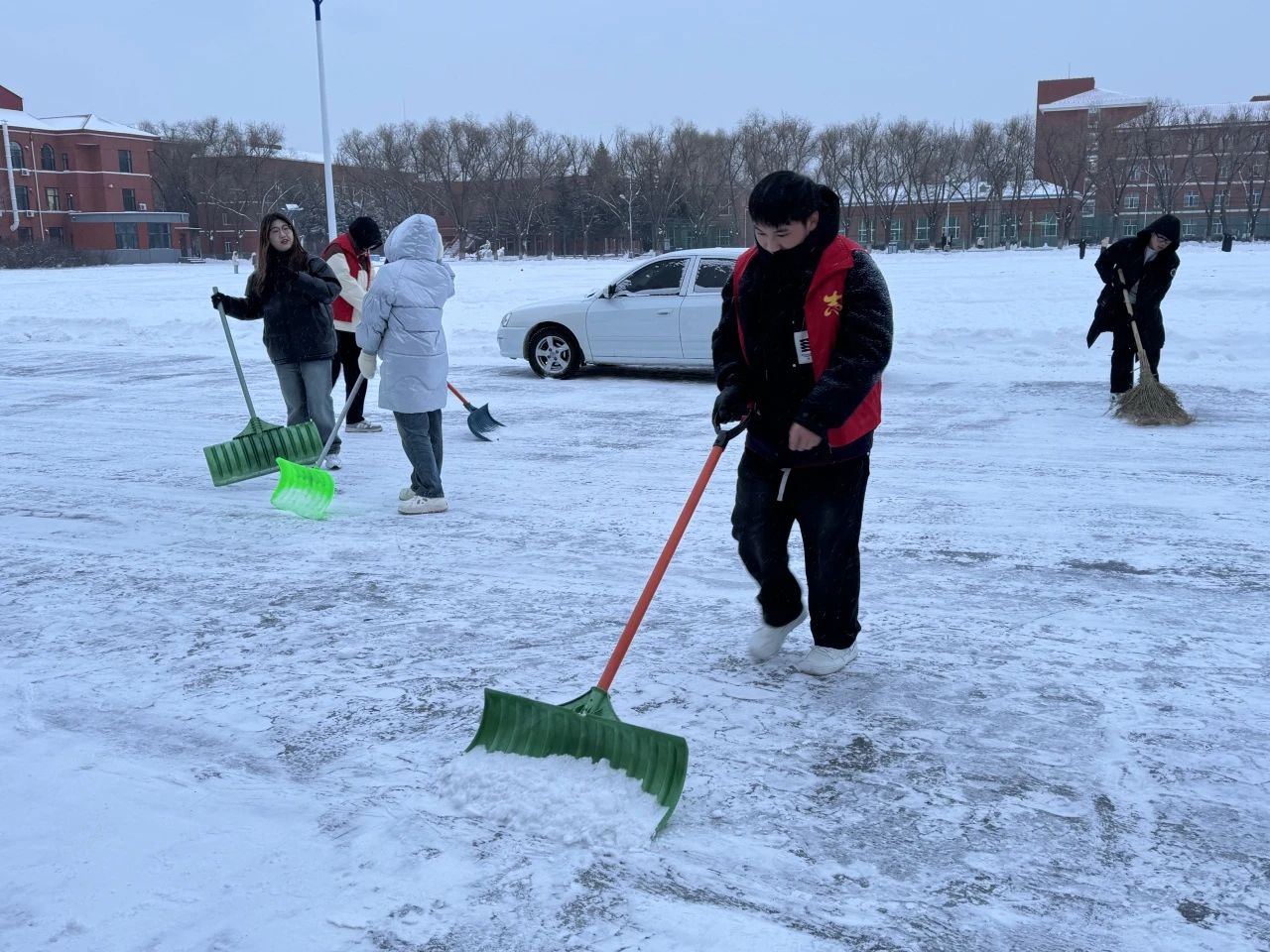 活动期间,在于海洋老师的带领下,那一群身着红马甲的志愿者们仿佛冬日里的暖阳,带着十足的热情和干劲投入到扫雪工作中。现场分工有条不紊,面对恶劣天气与积雪难题,他们靠团结协作一一化解,这份努力换来道路的整洁与畅通。而在活动落下帷幕之际,志愿者们虽身体疲惫,但脸上那幸福的笑容璀璨夺目,他们因这扫雪的显著成果而满怀骄傲。