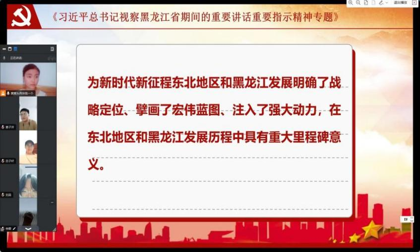 通过这次《习近平总书记视察黑龙江省期间的重要讲话重要指示精神专题》的学习,同学们深刻理解党对黑龙江发展的全面领导,坚定信心,在党的旗帜下,向着实现中华民族伟大复兴中国梦的黑龙江篇章奋勇前行,为黑龙江全面振兴全方位振兴贡献自己的一份力量。