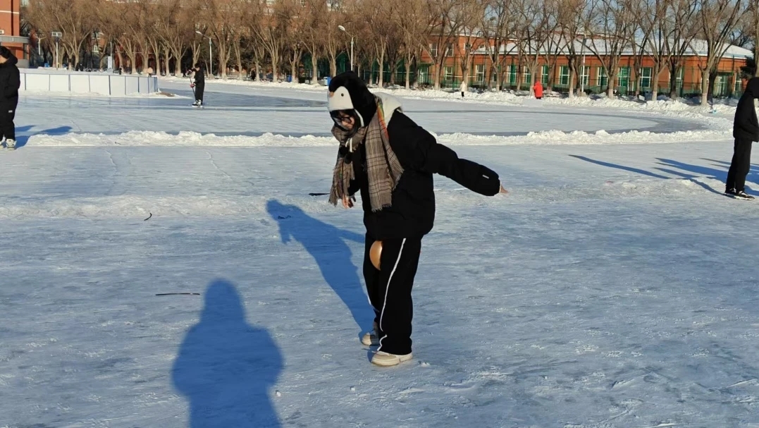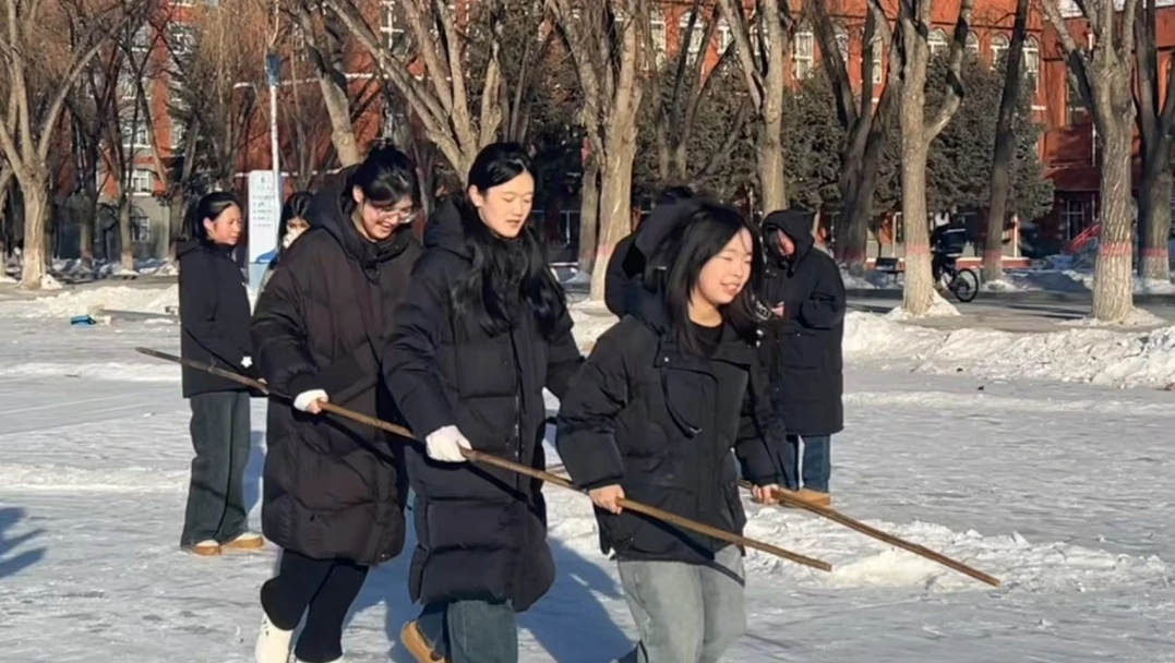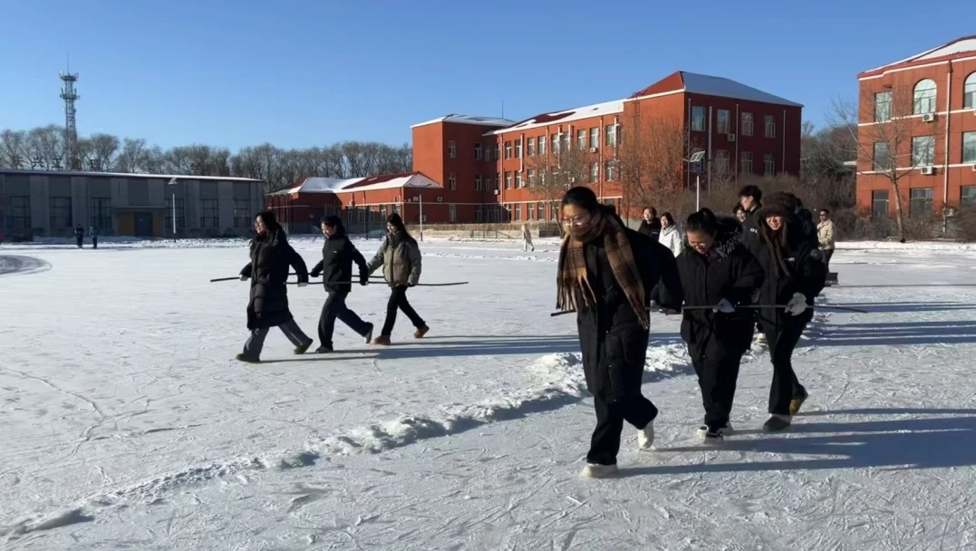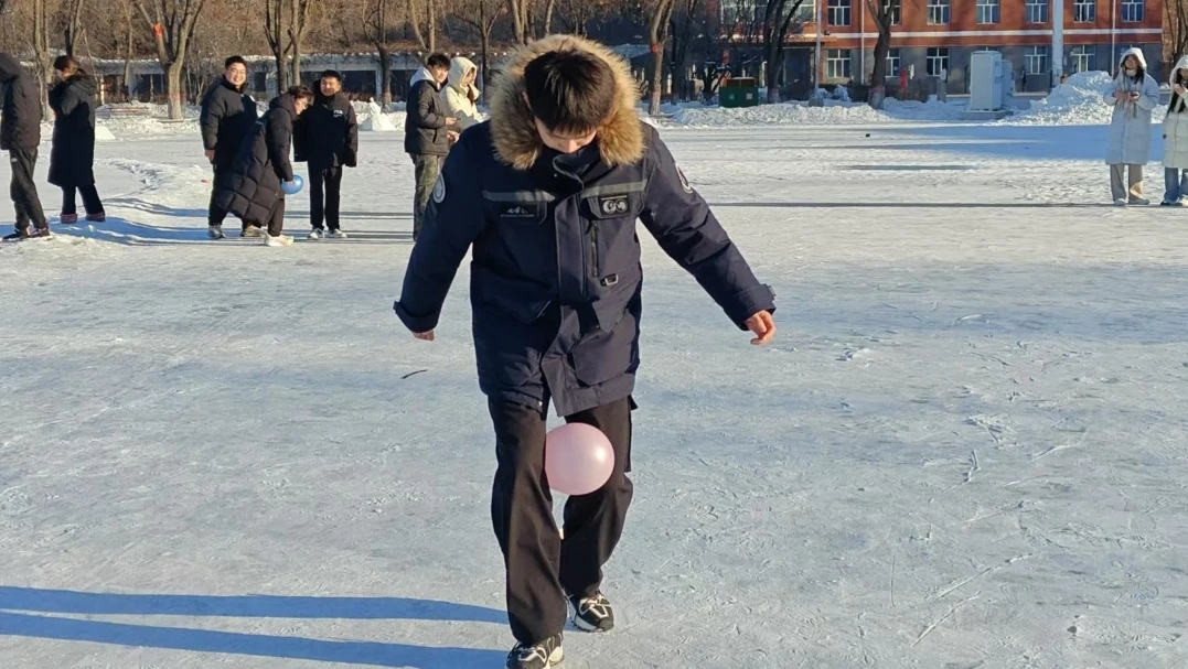 冰上竞走比赛,以三人小组为单位,同学们手挽长杆,步伐矫健地进行往返跑,周围观众的加油助威声此起彼伏,让赛场气氛达到高潮。