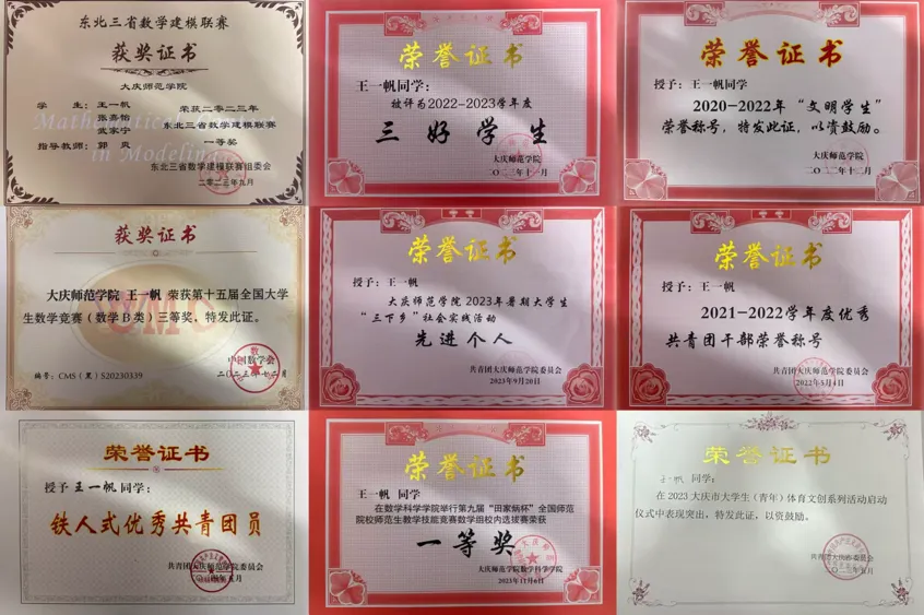 在庆师的学业生涯历程中,王一帆一路高歌猛进,不但在专业知识学习上取得优秀成绩,而且在各个实践环节、综合素质拓展领域表现非凡。竞赛舞台上,王一帆光芒四射。省级比赛中,2023年12月,她在第十五届全国数学竞赛中,获得三等奖;同年9月,在东北三省数学建模联赛里,通过团队团结协作,取得一等奖;在田家炳杯全国师范院校师范生教学技能竞赛数学组校内选拔赛中,也取得一等奖。