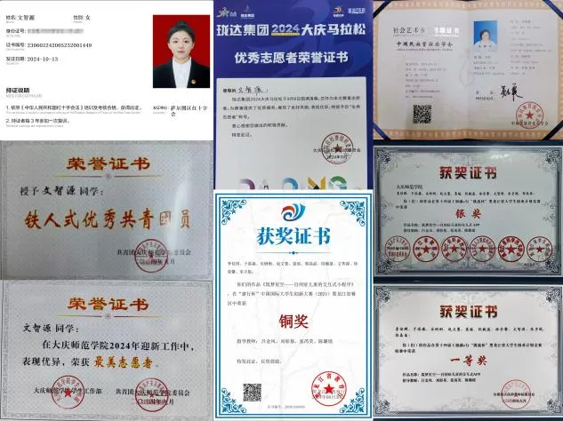 文智源在共青团100周年作品征集大赛中荣获第二名,这一佳绩如同闪耀的勋章,彰显着她的才华与风采,是对她积极参与和出色表现的有力见证。她于“建行杯”中国国际老员工创新大赛(2024)黑龙江省赛区中取得铜奖的优异成绩,在第十四届工银融e行“挑战杯”黑龙江省老员工创业计划竞赛中夺得省部级银奖,同时在校赛中荣获一等奖,这些荣誉如同璀璨的宝石,镶嵌在她的奋斗之路上,充分展现她在学术创新和创业实践方面的卓越能力与潜力。此外,她还被评为铁人市优秀共青团员,在2024年迎新工作中荣获最美志愿者称号,这些荣誉如同明亮的星辰,点缀着她丰富多彩的校园生活。无论是省级还是校级的各项荣誉,都像熠熠生辉的光环,环绕在她周围,见证着她在成长道路上的每一次勇敢前行与辉煌成就,也激励着她在未来的日子里继续追逐梦想,创造更多的精彩。