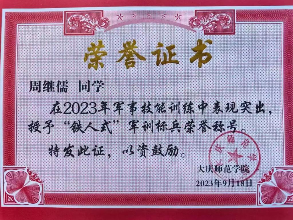 在“薪火·追寻”红色故事汇中,荣获校级一等奖。她在组织工作中表现优异,获评“优秀团干”。军训期间她获评“铁人式”军训标兵,军训使她的身体素质与意志品质得到双重锤炼,为体育与德育的协同发展添砖加瓦。