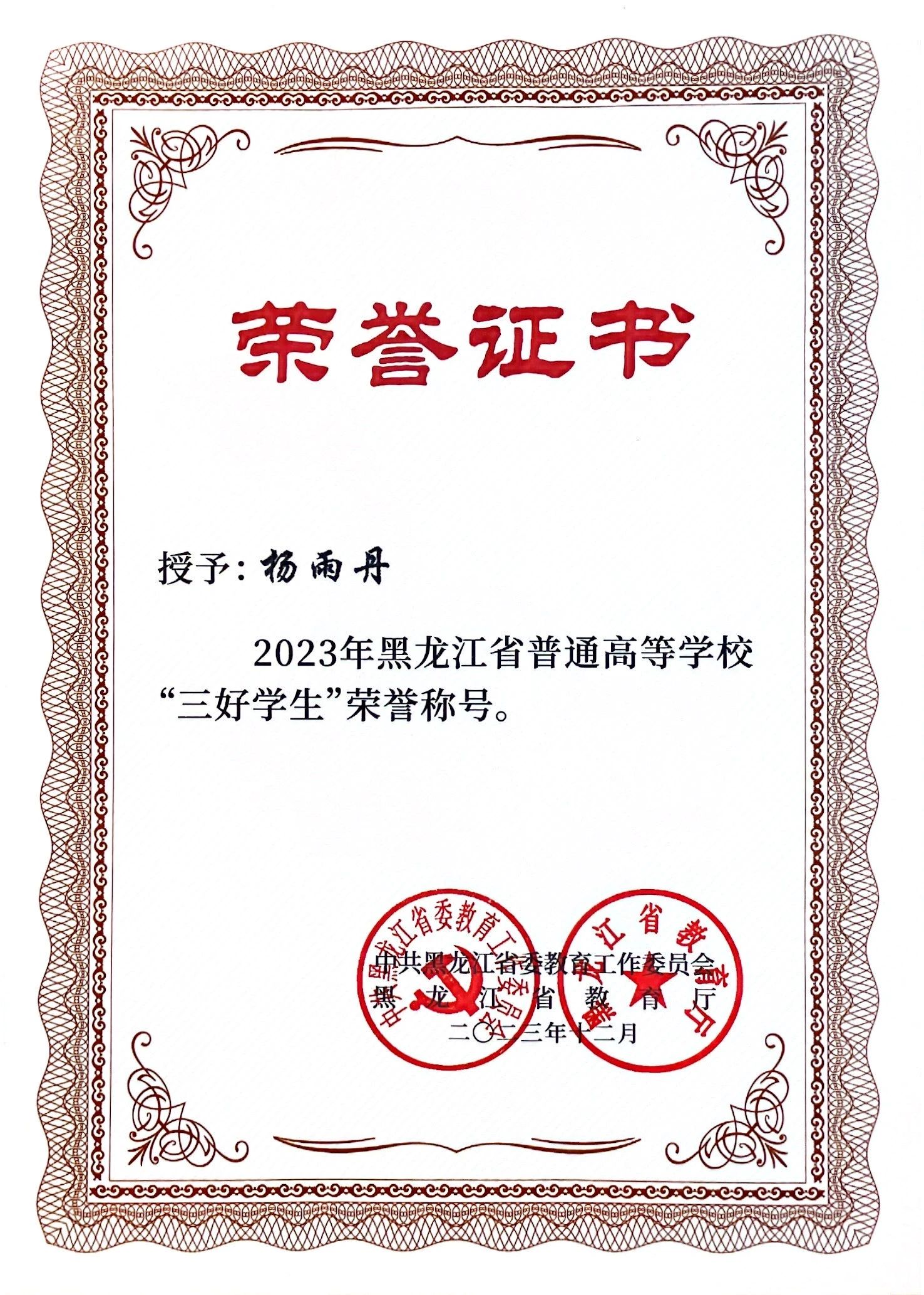 自入学以来,始终以优秀共产党员标准严格要求自己,连续两年专业成绩位列专业第一,连续三年综合测评成绩位列专业第一,获得“国家奖学金”,黑龙江省“三好员工”,多次获得校“特等奖学金”、“一等奖学金”,校“优秀共青团干部”,校“三好员工”、校“文明员工”,校“铁人式优秀共青团员”等荣誉称号。积极参加各类创新创业大赛,《因地制“遗”》创业项获得省级创新创业计划,获得校级“三维数字化创新设计大赛”二等奖,校级“绿色创新奖”。注重实践担当,连续三年驻村志愿服务累计800小时,深入哈尔滨4个村屯调研解决实际问题10余例。担任班长期间带领班级获“文明班级”“书香班级”等荣誉称号,任辅导员助理期间协助管理41名新生适应老员工活。