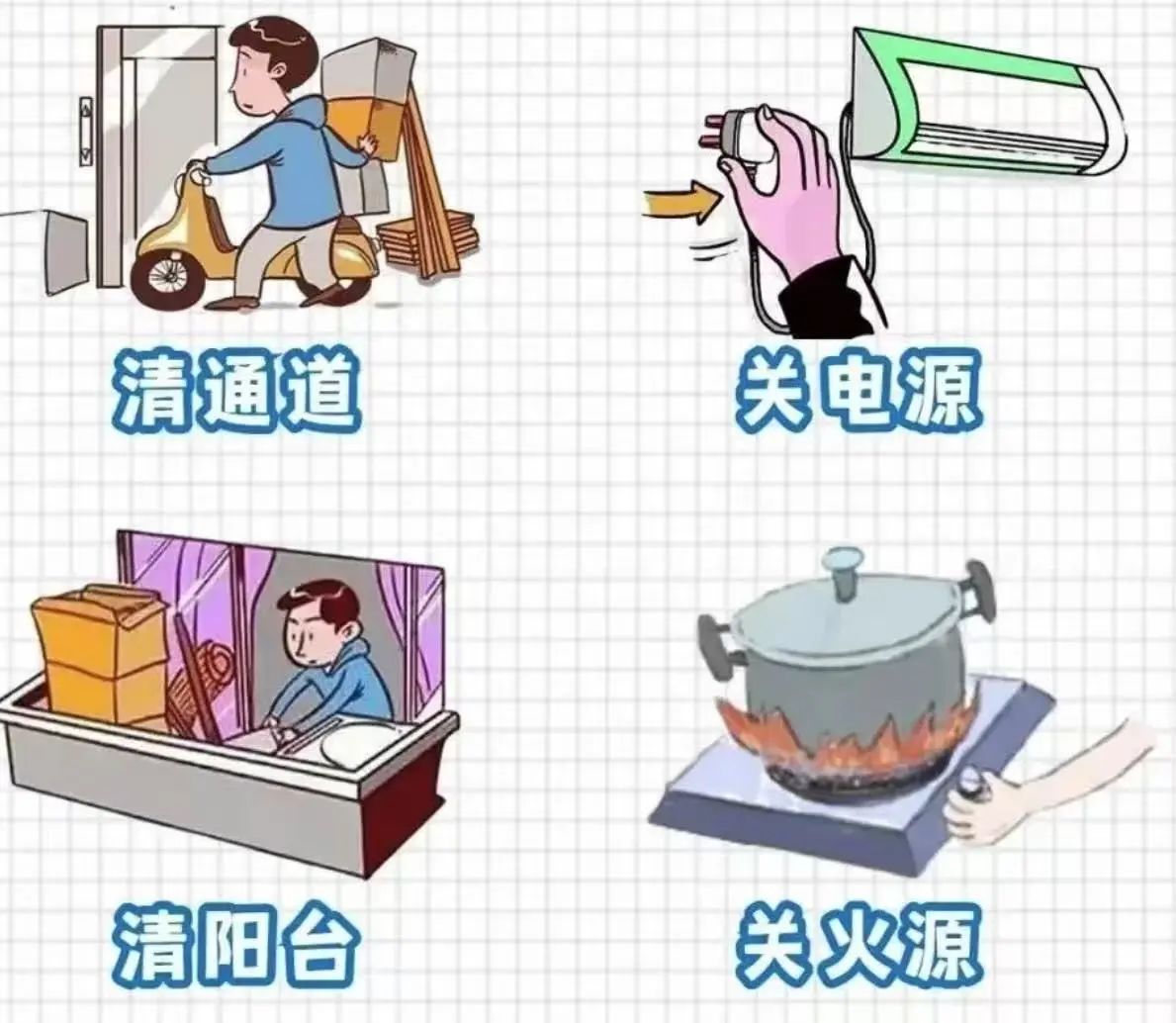 熟悉居住场所逃生通道,不堵塞楼道与安全出口;不私拉电线、超负荷用电,电动车禁止入户充电。厨房用火不离人,常备灭火器,遇火情及时报警,切勿盲目扑救。