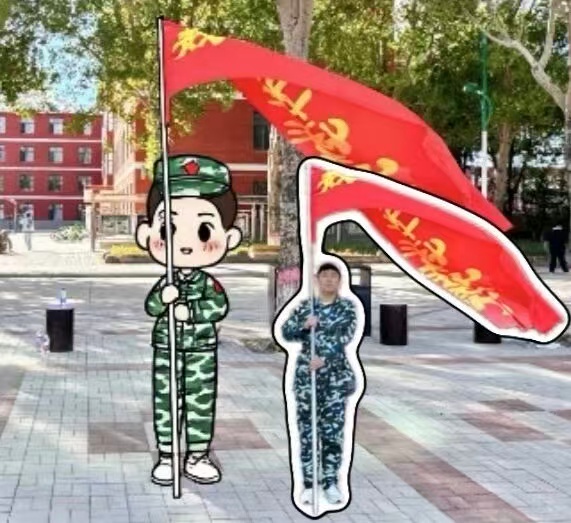 扛连旗的同学也有Q版形象!现实里扛旗超有担当,Q版里变成抱着大旗的“小大力士”,圆乎乎的手抓着旗杆,连旗帜都仿佛变得软萌起来~