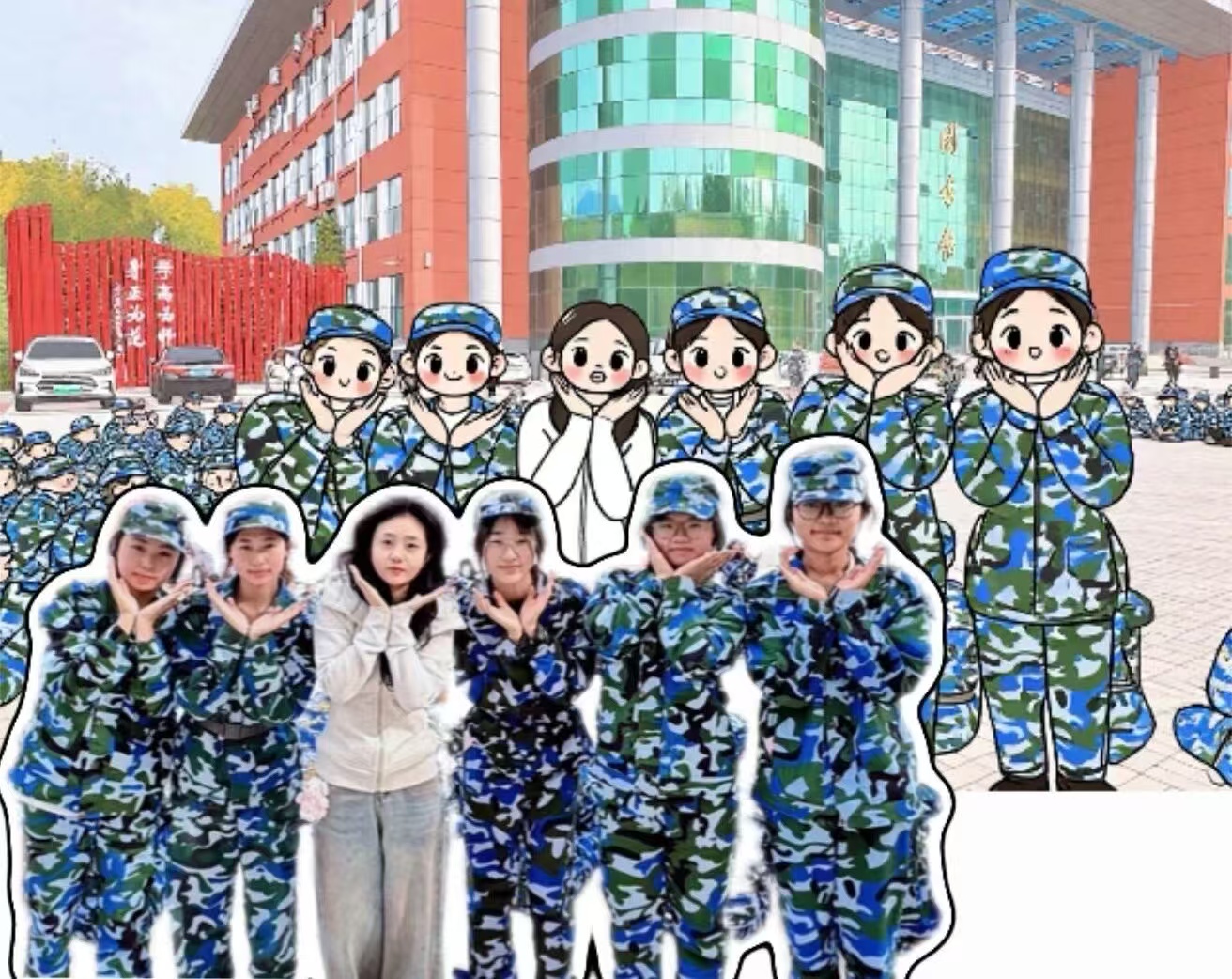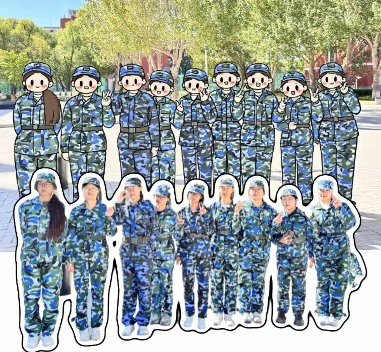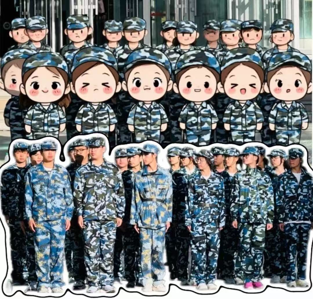 还有同学比耶的合照,现实里活力满满,Q版里小人儿们举着小拳头、比着剪刀手,笑容都要从卡通脸蛋里溢出来,把军训的快乐都定格住~