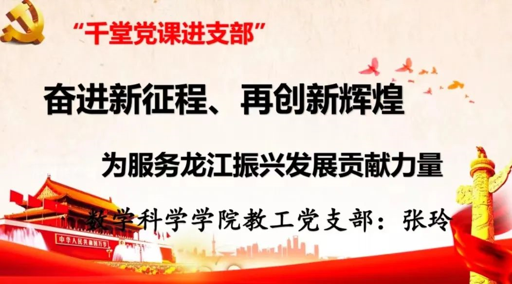 教工党支部书记张玲以《奋进新征程 再创新辉煌——为服务龙江振兴发展贡献力量》为题,从黑龙江各项事业取得新成效、以坚定信心和昂扬斗志再创龙江新辉煌、奋力推进全面振兴全方位振兴开创新局面、在新的赶考之路上展现新作为和为龙江全面振兴贡献力量五个方面为全体教工党员讲授党课,并号召与会教师党员坚守理想信念,增强政治意识,在各自的工作岗位上恪守职责,践行一名共产党员的初心和使命,为龙江振兴和学校发展贡献力量。